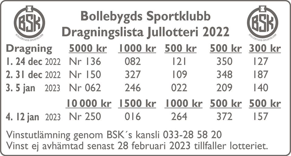 Varmt tack till alla som köpte lotter i föreningens jullotteri, tack för att ni stöttar Bollebygds Sportklubb. Stort grattis till alla våra vinnare! Pssst! Det går fint att boka ditt favoritnummer till Jullotteriet 2023 redan nu :) Kontakta kansliet 033-285820 kansli@bollebygdssportklubb.se Bollebygds Sportklubb 13 jan 2023 0kommentarer