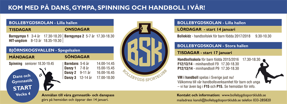 Nu är det inte långt kvar till uppstart av handboll-, gymnastik- och dansgrupperna efter lite välförtjänt julledighet. Anmälan till dans, gymnastik och hit, öppnar i en egen nyhet här på hemsidan lördag 14/1. Handbollens barngrupper startar upp 14/1 och 17/1. Varmt välkomna! Bollebygds Sportklubb 11 jan 2023 0kommentarer