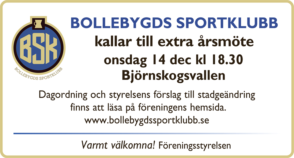 Bollebygds Sportklubb kallar till ett extra årsmöte onsdag 14 december 18.30 i klubbhuset på Björnskogsvallen. Dagordning och styrelsens förslag till stadgeändring finns att läsa under dokument klicka här Bollebygds Sportklubb 17 nov 2022 0kommentarer